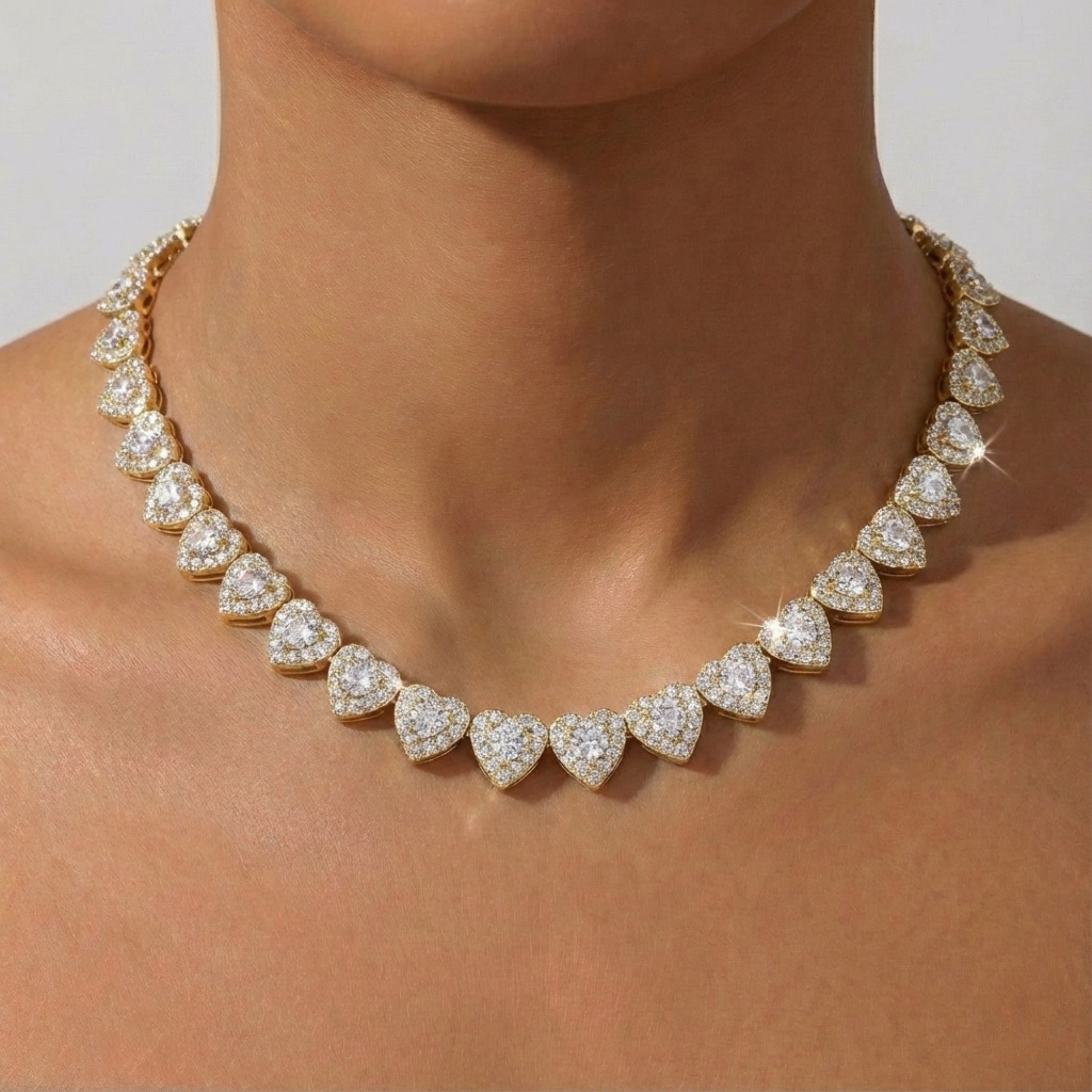 This 7mm tennis necklace features pavé hearts from end to end , the perfect mix of cute and captivating.