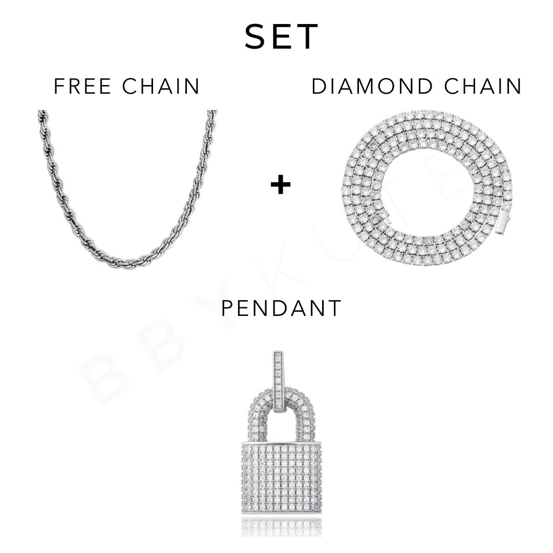 This set pairs a luxe diamond chain with a sleek rope chain, crowned by the signature Kute Lock pendant for effortless style.