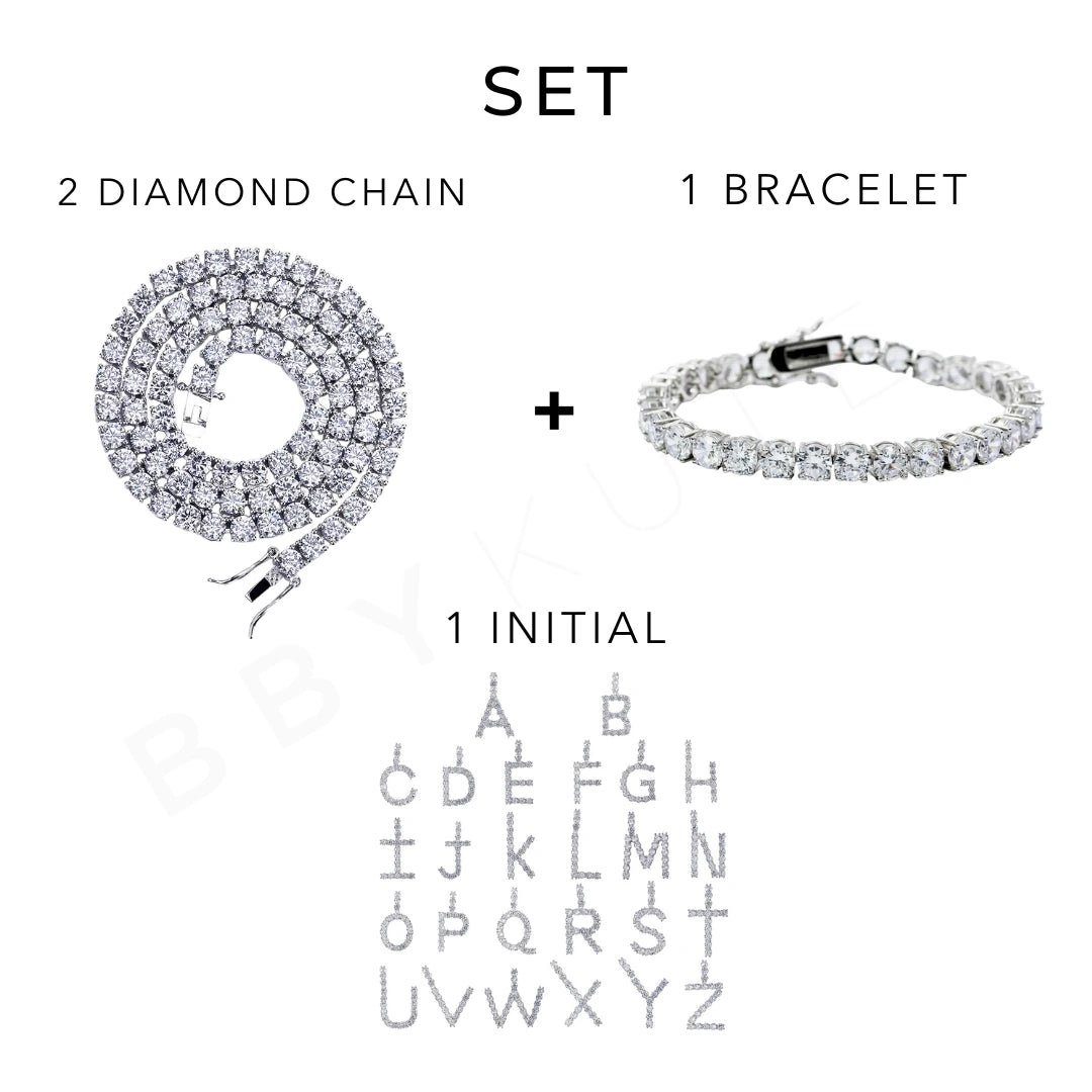This bundle pairs your bold diamond-font initial with the timeless shine of a tennis necklace and bracelet; built to stack, stun, and slay every look.